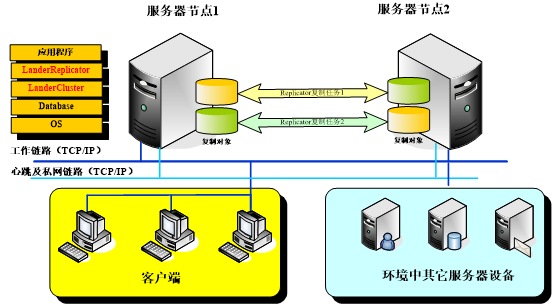 本方案是利用LanderReplicator对两台服务器上的业务数据系统进行实时复制,保证两台服务器之间关键数据的同步,在主机发生故障情况下,备用服务器会通过LanderCluster双机集群软件激活,快速投入使用。这样既避免了存储设备的单点故障,又可以节省大量投资,在某些数据量不大、访问量不大的环境中是非常好的解决方案。