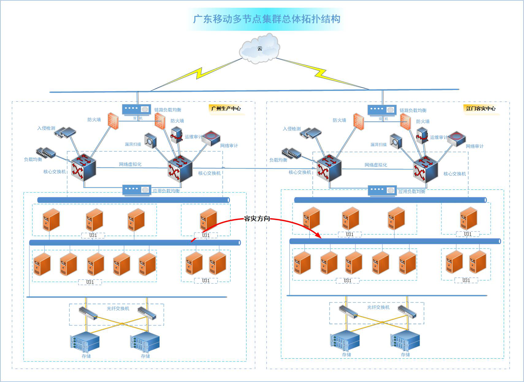 广州移动现有14台服务器,机房部署在广州,均安装U31系统和SQL Server数据库,服务器通过iscsi连接大容量存储,作为生产节点;在江门容灾机房中安装相同的环境,网络互通,作为容灾节点;生产节点和容灾节点之间使用联鼎多节点集群软件对数据和业务进行容灾保护。