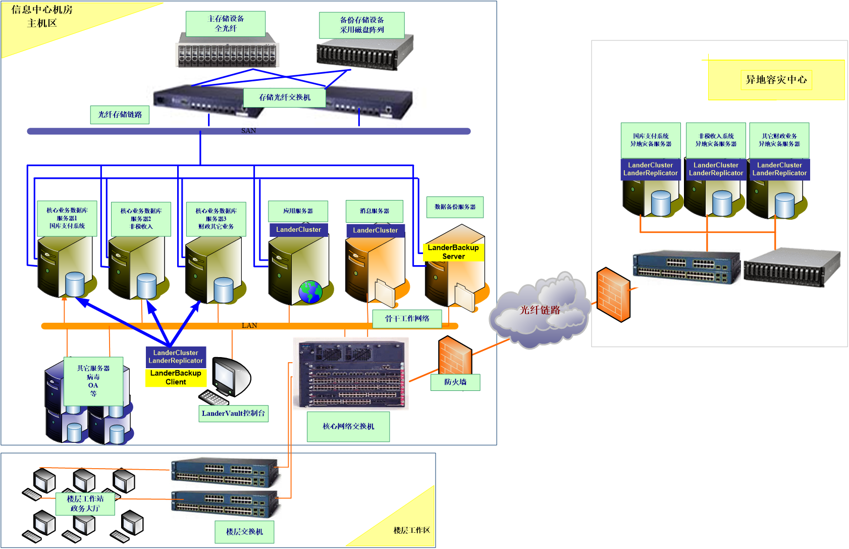 本次方案针对太仓财政局客户的典型业务系统,包括国库支付系统、非税收入系统、财政其他业务服务器、应用服务器和消息服务器等,采用LanderVault核心业务容灾一体化解决方案。