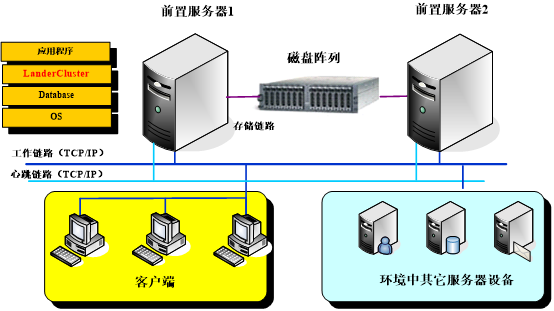 为了最大程度的保证前置机系统的可靠性和性能等因素,采用带共享存储设备的方式为用户构建了可靠的双机热备份系统。系统采用磁盘阵列用于存放数据库以及应用软件数据,与LanderCluster双机热备份软件结合来实现7×24小时运行的目标。