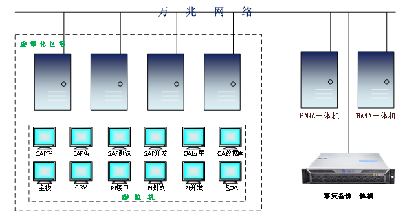 阜丰集团目前的SAP应用运行在VMware的虚拟化环境中,HANA一体机为厂家直接发货的物理设备。用户前期充分的调研了市场上国内外的容灾备份产品,目前国内外的同类产品大多数的解决方案是通过接口定时备份HANA数据,RPO/RTO较大,业务主机一旦发生故障,就无法还原完整的业务,只能还原部分的HANA数据,对业务帮助不大,而针对VMware的备份大多数的解决方案为安装代理定时备份,RPO/RTO较大不符合用户的预期,经过实际环境的测试和试用最终选择了联鼎软件的容灾备份一体机来为SAP系统保驾护航。